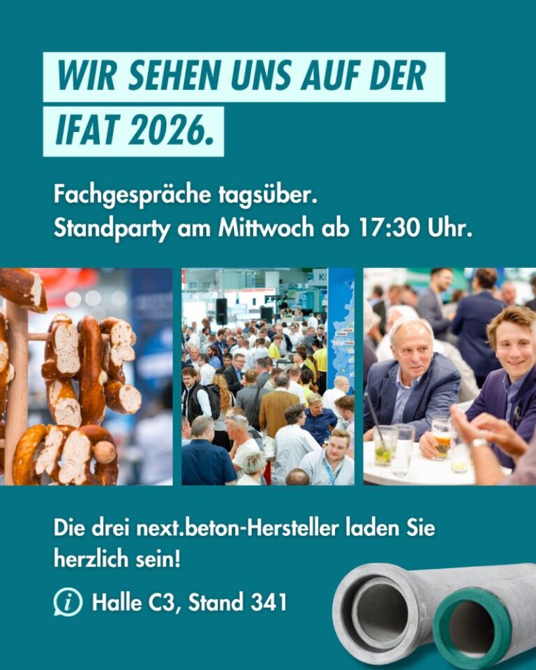 Sie möchten sich vor Ort mit Expert:innen zu next.beton austauschen? Wir vergeben sechs IFAT-Tickets an interessierte Fachbesucher:innen für ihren Messebesuch in München!