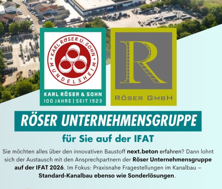 Treffen Sie Karl Röser & Sohn GmbH // Röser Firmengruppe – Betonfertigteile auf der IFAT Munich 2026 – als einen der drei Hersteller hinter next.beton, dem 100 % zementfreien Betonkanalsystem