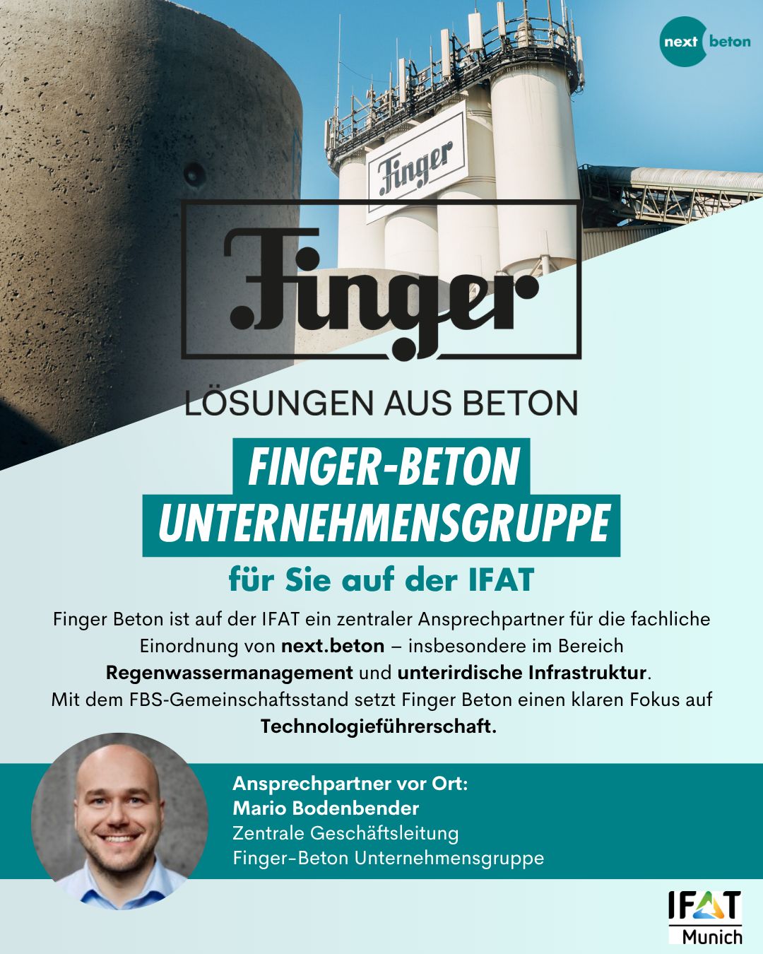 9. April 2026Treffen Sie die Finger-Beton Unternehmensgruppe auf der IFAT Munich 2026 – als einen der drei Hersteller hinter next.beton, dem 100 % zementfreien Betonkanalsystem.