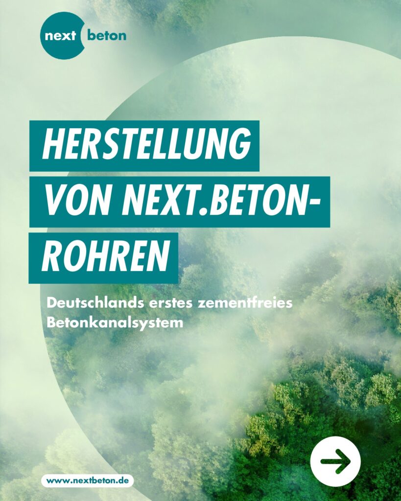 Mit next.beton wird der traditionelle Produktionsprozess von Betonrohren völlig neu gedacht: Dabei wird der Zement vollständig durch umweltfreundliche Geopolymere ersetzt. Dieses innovative Bindemittelsystem bietet nicht nur drastische CO₂-Einsparungen, sondern auch technische Vorteile.
