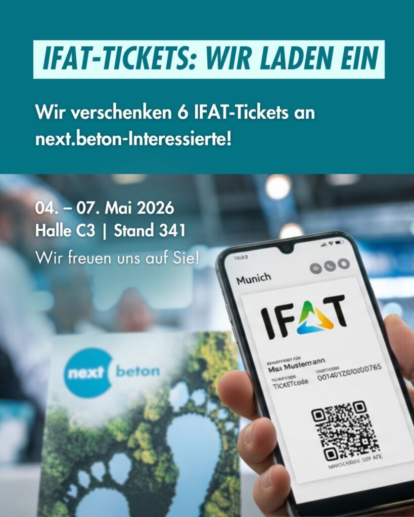 13. April 2026Sie möchten sich vor Ort mit Expert:innen zu next.beton austauschen? Wir vergeben sechs IFAT-Tickets an interessierte Fachbesucher:innen für ihren Messebesuch in München!